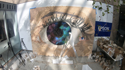 Selon l’artiste Sarah Hodgkins, du studio Charlotte’s Designs, à l’origine de l’œuvre : « Cette œuvre murale est au croisement de l’art et de la technologie, et constitue un irrésistible point de rencontre pour le stand. Je trouvais que l’image d’un œil correspondait bien au slogan d’Epson « Exceed Your Vision ». En adoptant le format d’une mosaïque, j’ai pu mettre en lumière les différentes finitions, couleurs et textures que permettent d’obtenir les imprimantes Epson. J’ai utilisé une finition mate pour la peau autour de l’œil et une finition réfléchissante pour l’œil à proprement dit. L’autre gros avantage de l’utilisation des imprimantes d’Epson était que j’ai pu employer un subtil dégradé de couleurs afin que, de loin, la fresque ressemble à un tableau. »