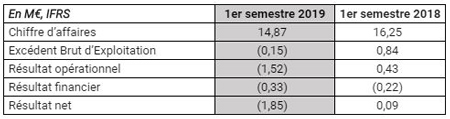 Le résultat avant impôt du premier semestre 2019 affiche une perte de 1 851 k€, contre un bénéfice de 217 k€ au cours du premier semestre 2018. Hors provision pour restructuration de 0,73M€, la perte avant impôt est de 1 121 k€.