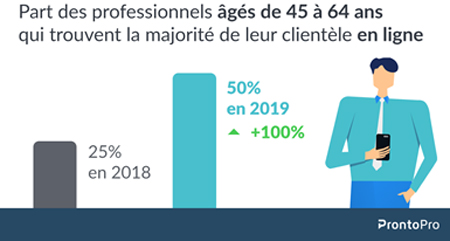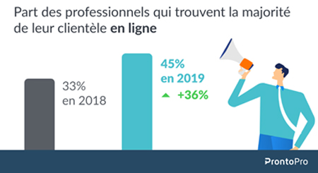 Une enquête de ProntoPro.fr , le portail qui relie l’offre et la demande de services professionnels, montre que près d’un professionnel sur deux (45 % des répondants) a trouvé la majorité de ses clients en ligne, un chiffre qui a augmenté de 36 % par rapport à 2018, où un professionnel sur trois déclarait alors être entré en contact avec la plupart de ses clients via le portail.