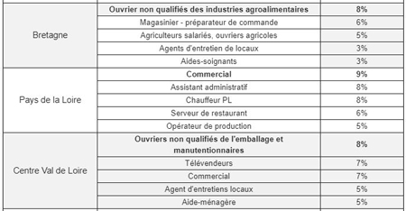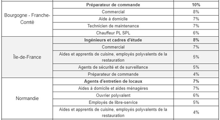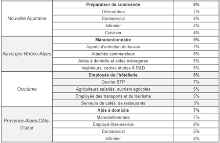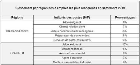 Aide-soignant (H/F), aide à domicile, aide-ménager, nounou... voilà des exemples de métiers recherchés et surreprésentés dans 3 régions de France : Hauts-de-France avec 8%, Grand-Est avec 10%, et Provence-Alpes-Côte-D’azur avec 7%.