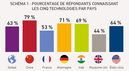 Les dirigeants chinois sont ceux qui ont la plus forte connaissance des cinq technologies (79%), suivis par l’Allemagne (71%), l’Inde (69%), et les Etats-Unis (64%). La France (53%) et le Royaume-Uni (44%) arrivent en queue de peloton.