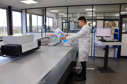 Très rapide (180 m2/heure), adaptée à tous types de formats (jusqu’à 2 m) sur des supports épais jusqu’à 5 cm, simple à régler, cette table d’impression numérique de dernière génération est complémentaire à la traditionnelle sérigraphie, face à laquelle les cadences sont multipliées par 2. Au sein de l’équipe, les 4 sérigraphes ont été formés à la programmation de la nouvelle Impala.