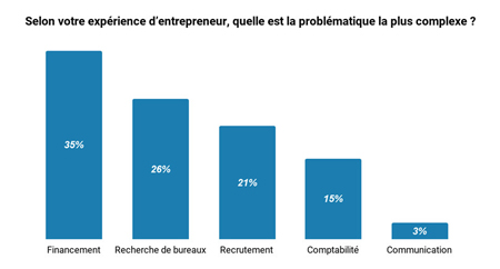 Pour les entrepreneurs, toutes les tâches et missions liées à la création et gestion de d’une entreprise ne se ressemblent pas. Le financement de leur activité (35%) est ainsi la problématique la plus complexe de toutes, suivie par la recherche de bureaux (26%). Le recrutement complète le trio de tête avec 21% des voix.
