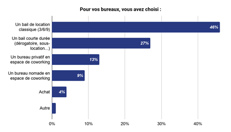 Concernant les différentes solutions existantes, le bail commercial traditionnel (ou 3/6/9) reste la norme (46%) devant le bail de courte durée (27%).