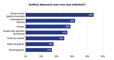 Si les mauvaises surprises peuvent être nombreuses, le temps humain de gestion de projet est de loin ce que les sondés ont le plus sous-estimé (44%). Selon le co-fondateur de Deskeo : On ne se rend compte de la complexité d’un déménagement de bureaux qu’après y avoir été confronté. Il faut trouver des architectes, un conducteur de travaux, sourcer le mobilier... C’est un vrai métier et la plupart des entreprises n’ont pas accès à ces compétences. Des nouvelles solutions comme Deskeo permettent de réduire le nombre d’interlocuteurs de bout en bout pour permettre aux entreprises de se concentrer sur leur activité.