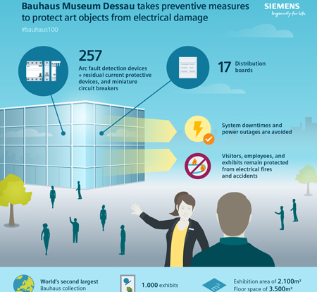 L’installation de Siemens Smart Infrastructure comprend 17 panneaux de distribution Alpha équipés de dispositifs de protection contre les courants résiduels (DPCR) et de disjoncteurs miniatures (DM), plus un total de 257 dispositifs de détection de défauts d’arc (DDDA) de sa gamme Sentron. Ces appareils de protection permettent d’éviter des accidents électriques et incendies et protègent les pièces de grande valeur exposées au sein du musée Bauhaus de Dessau.