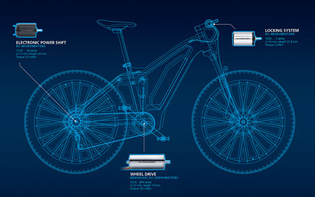Les micromoteurs C.C. des séries 1524/1724SR garantissent également un bon entraînement lors du passage de vitesses, sur les bicyclettes standard comme sur les pédélecs. Des systèmes de changement de vitesse électroniques assurent une conduite efficace et augmentent le confort et la sécurité. Parallèlement, ils réduisent l’usure des composants du système de changement de vitesse. Le passage des vitesses est accompli à l’aide des petits servomoteurs.
