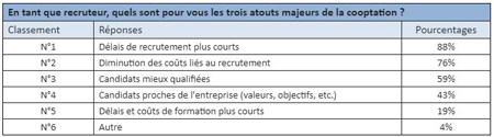 Pourtant, les recruteurs voient énormément d’avantages à la cooptation. Ainsi, 88% mettent en avant la diminution des délais d’embauche. Le deuxième atout concerne à 76% les coûts plus faibles liés au recrutement. Une meilleure qualification des candidats est plébiscitée par 59% des recruteurs, bien loin devant la proximité des candidats aux valeurs de l’entreprise (43%) ou encore pour des délais et coûts de formation plus faibles (19%).