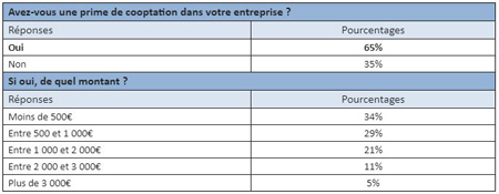 Beaucoup d’entreprises (65%) proposent une prime accordée au salarié qui déniche pour l’entreprise une perle rare dans son entourage. Les montants de ces primes sont très variables en fonction des sociétés. Ainsi, 34% des entreprises interrogées ne vont pas au-delà de 500€. 29% oscillent entre 500 et 1 000€, 21% vont jusqu’à 2 000€ et 11% poussent jusqu’à 3 000€. Seulement 5% de chanceux peuvent espérer plus de 3 000€ de prime à la cooptation.