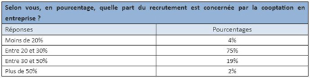 A la question, « Selon vous, en pourcentage, quelle part du recrutement est concernée par la cooptation en entreprise ? », 75% des personnes interrogées déclarent entre 20 et 30%. Une moyenne beaucoup plus basse que les chiffres communément admis.