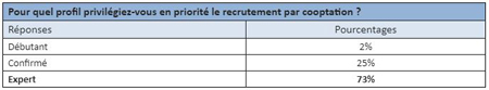 Les recruteurs font appel à la cooptation pour des profils bien définis. Ainsi, seulement 2% l’utilisent pour embaucher des personnes débutantes et seulement 25% pour des salariés confirmés dans leur travail. En revanche, 73% prônent la cooptation pour des profils d’experts dans leur métier.