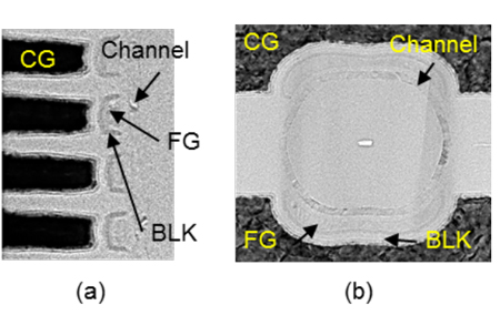 La technologie de mémoire Flash 3D a pu atteindre une densité de bits élevée associée à un faible coût au bit, en augmentant le nombre de couches empilées par cellule, et en mettant en œuvre le dépôt multi-couches et la gravure à rapport profondeur/largeur élevé. Ces dernières années, alors que le nombre de couches par cellule a dépassé 100, réaliser les compromis entre le profil de gravure, l’uniformité dimensionnelle et la productivité, est de plus en plus difficile. Pour surmonter le problème, KIOXIA a développé une nouvelle architecture de cellule semi-circulaire, en coupant en deux l’électrode de grille de la cellule circulaire conventionnelle, afin d’obtenir une cellule plus petite qu’une cellule circulaire conventionnelle, ce qui a permis d’obtenir une mémoire de densité supérieure avec un nombre inférieur de couches par cellule.