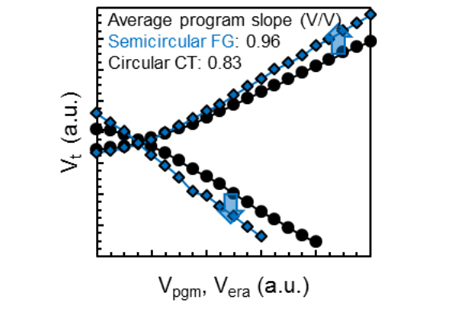 Figure 2 : Comparaison des caractéristiques de programmation/effacement expérimentales des cellules semi-circulaires FG et des cellules circulaires CT