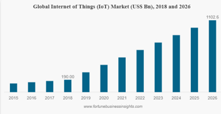 Selon une étude Fortune Business Insight Le marché mondial de l’Internet des objets (Iot) a été évalué à 190,0 milliards de dollars américains en 2018 et devrait atteindre 1 102,6 milliards de dollars américains d’ici 2026, affichant un TCAC de 24,7 % pendant la période de prévision.