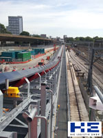 Dans les deux tunnels de 6,2 m de diamètre creusés en parallèle sous le centre de la ville, les tunneliers extraient jusqu’à 1 300 tonnes d’« argile londonienne » par heure. Le transport de ce matériau requiert des solutions adaptées à sa consistance. En l’occurrence, la difficulté réside dans le transport fiable des matériaux creusés hors du chantier, ce qui inclut leur acheminement sur des convoyeurs de machine, tunnel et site avant leur chargement sur des trains. La construction de tunnels de pointe inclut l’ajout d’agents de surface, dits tensio-actifs, aux matériaux creusés directement sur les tunneliers pour faciliter leur manutention. Mais en cas de contact de l’argile londonienne et de ces additifs avec des convoyeurs standard, des complications peuvent survenir : la masse s’accumule rapidement et constamment sur certains éléments des convoyeurs. Les convoyeurs de tunnel du projet London Crossrail ont donc dû être spécialement adaptés par H+E Logistik, filiale de Herrenknecht. Outre des revêtements en plastique spéciaux et d’autres mesures, un système d’essuie-glace développé spécialement pour répondre aux besoins du site permet d’empêcher les problèmes liés à l’adhésion des matériaux convoyés sur les composants exposés des systèmes.