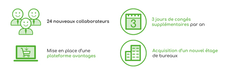 La mise en place d’une véritable politique RH, avec un investissement dans le bien être des collaborateurs : Rémunération attractive, Bonus et challenges, Primes semestrielles, Postes évolutifs, Mutuelle et prévoyance, Tickets restaurants, Moments festifs, team building, etc…