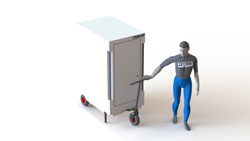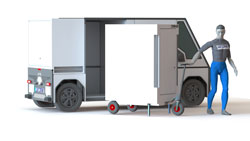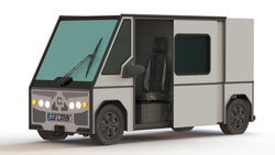 Un véhicule utilitaire urbain électrique de petite taille, conçu exclusivement pour ce besoin, donnant la possibilité de transporter deux containers amovibles d’1,5m3 chacun