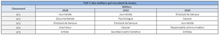 Si le métier de journaliste est resté en tête des professions les moins attractives depuis 2018, il se place à la troisième position en 2020. C’est le métier d’Employé de banque qui prend la première place, juste devant celui de caissier. Les responsables de communication sont à la quatrième place et les artistes sont en cinquième position.