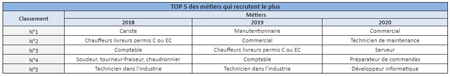 Le TOP 5 des métiers qui recrutent le plus : Commercial, Technicien de maintenance, Serveur, Préparateur de commandes, Développeur informatique.