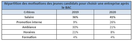 De plus en plus de jeunes choisissent une société pour le salaire : 36% en 2019 contre 41% en 2020.
