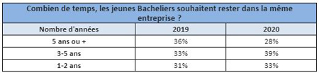Finalement, les jeunes de 2020 semblent ne plus vouloir rester aussi longtemps dans la même entreprise. En effet, 36% des Bacheliers espéraient rester 5 ans ou plus dans la même entreprise en 2019 et ils ne sont plus que 28% dans ce cas en 2020. La majorité revient à celles et ceux qui veulent conserver leur poste entre 3 et 5 ans, soit 39% en 2020. Enfin, les 31% qui ne voulaient pas faire plus de 2 ans dans la même boite en 2019 sont en 2020 plus de 33%.