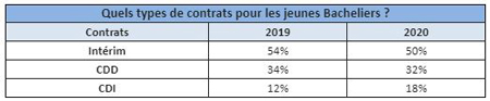 L’intérim reste le premier type de contrat prisé par les jeunes bacheliers avec 50% de représentativité en 2020 (54% en 2019). Une volonté très forte avec l’objectif d’acquérir de l’expérience professionnelle et de mieux cerner l’étendue d’un métier avant de s’engager. Les CDD arrivent toujours en deuxième choix à 32% (34% en 2019), devant les CDI qui passent de 12% en 2019 à 18% en 2020.