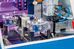 Le transport des palettes entre les différentes unités d’ébavurage est effectué par un système linéaire dynamique intégré de série avec moteur sans usure. Il transporte les pièces à la station suivante à une vitesse de 4 à 5 mètres par seconde. Il contribue lui aussi à l’efficacité de l’installation dans son ensemble.