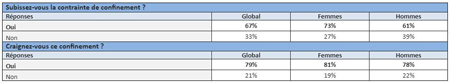 Il semble que la notion de confinement ne soit pas une contrainte pour la totalité des Français. En effet, si 73% des femmes et 61% des hommes déclarent rester chez eux, 33% des Français conservent apparemment une activité professionnelle « normale ». En revanche, globalement cette situation de confinement provoque un sentiment de crainte chez 79% des personnes interrogées.