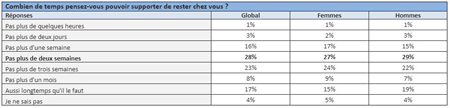 Si le confinement doit durer plus de 14 jours, les Français risquent de très mal le vivre. En effet, seulement 23% se sentent capables de rester chez eux trois semaines, 8% pas plus d’un mois et seulement 17% aussi longtemps qu’il le faudra. Ainsi, pour 28% la limite acceptable ne peut pas dépasser 14 jours et 16% ne supportent déjà pas une semaine.