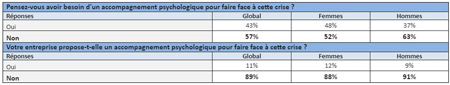 La crise risque de laisser également des traces psychologiques sérieuses. En effet, 37% des hommes et 48% des femmes interrogées pensent avoir besoin d’un accompagnement psychologique pour faire face à la crise du coronavirus. Malheureusement, les Français devront certainement se débrouiller par eux-mêmes puisque 89% des entreprises ne proposent aucun accompagnement psychologique à l’heure actuelle.