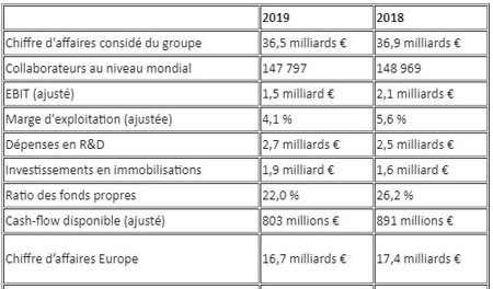 Le bénéfice d’exploitation ajusté s’est élevé à 1,5 milliard d’euros contre 2,1 milliards d’euros en 2018, tandis que la marge de bénéfice d’exploitation ajustée se situe à 4,1% vs 5,6 % en 2018. Les bénéfices ont été affectés à l’augmentation des dépenses en recherche et développement (R&D) et à la création de nouveaux sites pour les technologies futures, comme des sites de production de transmissions électriques en Allemagne, en Serbie ou encore en Chine. En outre, le résultat reflète le ralentissement économique dans l’industrie automobile. Le flux de trésorerie disponible, ajusté des fusions et acquisitions, s’est élevé à 803 millions d’euros en 2019 contre 891 millions d’euros en 2018.