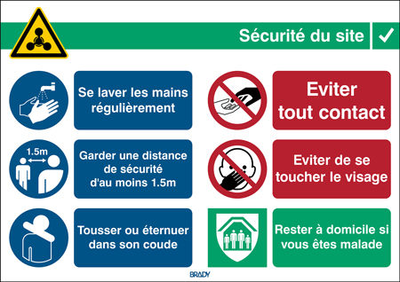 La durée et l’impact totaux de la propagation du Coronavirus étant encore peu clairs pour de nombreux pays et régions, les mesures de sécurité ou même les conditions d’accès dans les installations peuvent changer rapidement. Pour faciliter l’identification des mesures de sécurité en constante évolution dans certaines zones des installations, Brady a classé les panneaux de sécurité pertinents dans 4 catégories : information des visiteurs dans la zone de réception, rappel de la meilleure méthode de désinfection des mains, rappel aux collaborateurs le port de l’équipement de protection individuelle et communication des précautions de sécurité générales, telles que l’évitement des poignées de main et la distanciation sociale.