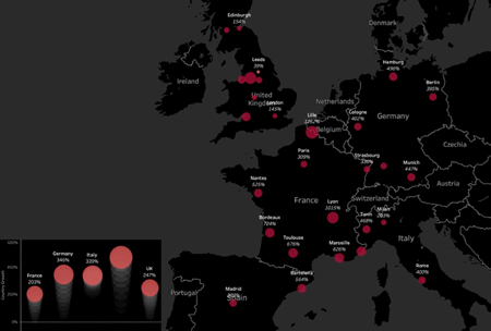 Dans les grands pays d’Europe occidentale par exemple, l’usage quotidien moyen des conférences avec BlueJeans Meetings a fortement augmenté par rapport à la moyenne quotidienne de fin février. Cette vidéo basée sur des données régulièrement actualisées montre au 02/04/20 la progression de l’usage de la visioconférence de BlueJeans par grande ville en France : +309% à Paris, +1 262% à Lille, +336% à Strasbourg, +676% à Toulouse, +626% à Marseille …) et en Europe de l’ouest.