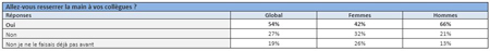 La poignée de main fait de la résistance et va encore survivre un peu pour rester dans les mœurs au travail... mais davantage chez les hommes ! Ainsi, 66% des hommes disent qu’ils continueront à serrer la main de leurs collègues contre 58% des femmes qui ne le feront plus.