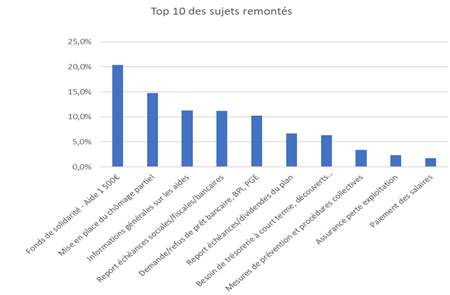 « Les entreprises cherchent principalement des sources de financement pour faire face à la crise actuelle. L’aide de 1 500€ du fonds de solidarité focalise beaucoup d’appels, probablement car elle concerne les indépendants, les micro-entreprises et nombre de TPE, catégories qui forment la majeure partie des appelants au N° Vert.
