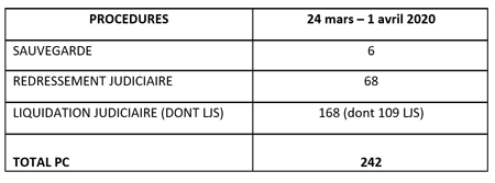 Les statistiques sur la deuxième semaine de confinement du 24 mars au 3 avril montrent un total de 242 procédures collectives équivalent à celui de la première semaine.