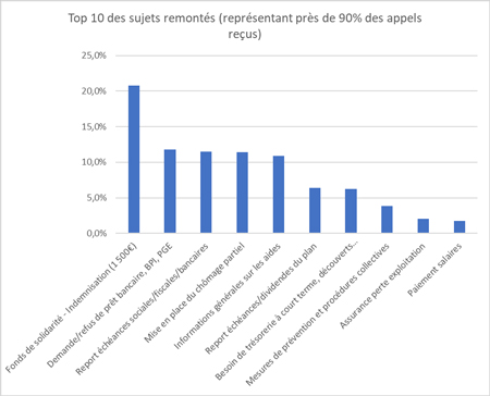 « Les entreprises cherchent principalement des sources de financement pour faire face à la crise actuelle. L’aide de 1 500€ du Fonds de solidarité demeure le sujet n°1 de questionnement des entreprises qui appellent, probablement car elle concerne les indépendants, les micro-entreprises et nombre de TPE, catégories qui font l’essentiel des appels au N° Vert.