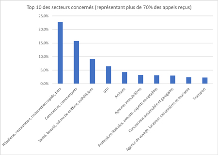 Toutefois, certains secteurs semblent plus particulièrement impactés par les mesures de confinement, en premier lieu ceux de l’hôtellerie-restauration (22,7% des appels) et du commerce de détail (près de 16% des appels).