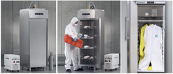 L’armoire de stérilisation PTSC580, d’un volume de 580 litres, contient des grilles amovibles sur lesquelles sont posées les pièces à désinfecter. Il existe également une version permettant de suspendre des combinaisons légères sur des cintres.