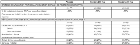 L’analyse des résultats cliniques de l’essai de phase II était exploratoire et devait être centrée sur les résultats des patients présentant des formes « sévères » et « critiques » de la maladie. L’analyse préliminaire des données de phase II a montré que Kevzara n’avait pas eu de bénéfice notable sur les résultats cliniques lorsque les groupes « sévères » et « critiques » ont été combinés. En revanche, des tendances négatives ont été dégagées pour la plupart des résultats cliniques dans le groupe de patients « sévères », tandis que des tendances positives ont été observées pour l’ensemble des résultats cliniques dans le groupe de patients « critiques » (voir tableau ci-dessous). Après l’examen réalisé par le Comité indépendant, Regeneron et Sanofi ont procédé à un examen des données du groupe de patients « sévères » qui a révélé que les tendances négatives observées pendant la phase II (n=126) ne se reproduisaient pas dans la phase III (n=276) et que les résultats cliniques étaient équilibrés pour tous les groupes de traitement. Les résultats du groupe de patients « sévères » étaient meilleurs que prévus, sur la base de rapports antérieurs, indépendamment du traitement reçu : ainsi dans la partie « phase II » environ 80 % des patients ont pu quitter l’hôpital, 10 % sont décédés et 10 % sont restés hospitalisés.