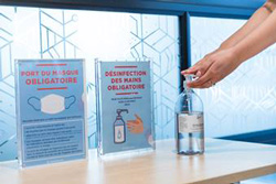 Rappel des gestes barrières avec un affichage spécifique et omniprésent dans l’enceinte des bâtiments.