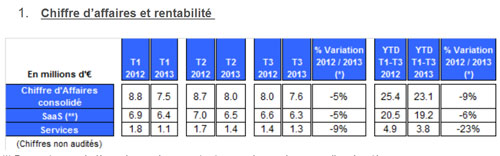 Le Chiffre d’Affaires du troisième trimestre s’élève à 7,7 M €, en baisse de 5% par rapport au même trimestre de 2012. La composante SaaS (**) s’élève à 6,3 M €, en baisse de 5% par rapport au troisième trimestre de 2012, alors que les Services sont en baisse de 9%.