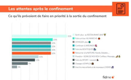 En pleine période de confinement, fidme réalisait un sondage auprès de 5 600 utilisateurs actifs de son application shopping, afin de mesurer l’impact du confinement sur leurs comportements d’achat, ainsi que leurs attentes et priorités à la sortie du confinement. Ces derniers prévoyaient déjà de profiter de leur liberté de déplacement pour retrouver diverses activités dès l’annonce du déconfinement.