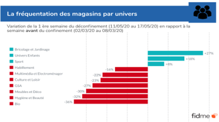L’univers du sport est le grand gagnant du déconfinement avec un boost (+601%) de fréquentation des magasins la semaine du 11/05 au 17/05 en rapport à la semaine précédente, l’habillement arrive en seconde position avec +328% de fréquentation, la culture & loisirs en troisième avec +321% de fréquentation, sans oublier l’univers enfant avec +229% de fréquentation en magasin.