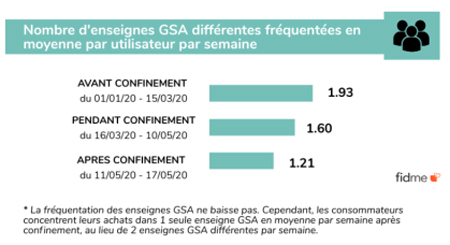 Pendant le confinement, ils ont dû restreindre leurs déplacements en magasin, on voit alors que sur la période du 16/03/20-10/05/20, les consommateurs ont fait leurs courses dans 1.6 enseignes GSA différentes en moyenne par semaine.