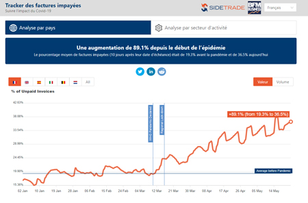 Sidetrade, en partenariat avec BFM Business, publie depuis le 22 avril le tracker sur les retards de paiement des entreprises. En libre accès pour l’ensemble des décideurs du privé et des pouvoirs publics, ce tracker suit chaque semaine l’évolution des comportements de paiement de plus de 3,7 millions d’entreprises au sein de 6 pays européens (France, Royaume-Uni, Espagne, Italie, Belgique, Pays-Bas).