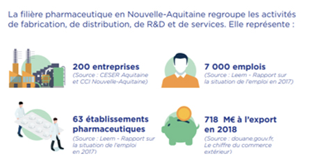 Les entreprises du médicament emploient environ 7000 personnes en région Nouvelle-Aquitaine, soit environ 6% de l’emploi du secteur au niveau national, selon les repères sur l’industrie du médicament en Nouvelle-Aquitaine, document publié en octobre 2019.