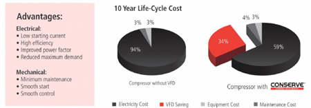 Le système de variateur de fréquence intégré (VFD), ELGi CONSERVE, permet d’adapter la production d’air à la demande réelle en faisant varier la vitesse du moteur, réduisant par là-même la consommation énergétique. Comparé à un compresseur sans VFD sur une période de 10 ans, la série EG permet de réaliser jusqu’à 34 pourcents de réduction des dépenses énergétiques.
