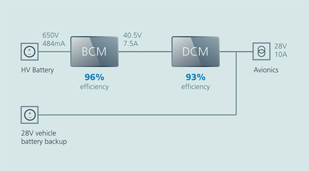 L’équipe de conception d’Ampaire a également demandé une taille compacte pour la solution, un rendement élevé, une gestion thermique simple, un prototypage rapide et un délai de production court. L’équipe ne souhaitait pas non plus concevoir ni utiliser de circuits imprimés pour le convertisseur de puissance. Sur la base de ce cahier des charges, l’équipe technique de Vicor a recommandé que la conversion et la régulation de puissance se fassent en deux étapes, afin d’optimiser le rendement et la densité de puissance, et aussi de simplifier la gestion thermique. Un module BCM (Bus Converter Module, ou convertisseur de bus à rapport fixe) serait utilisé pour isoler et abaisser la tension fournie par la batterie haute-tension, et serait suivi d’un second convertisseur continu-continu basse tension, chargé de réguler la sortie du module BCM à 28V.