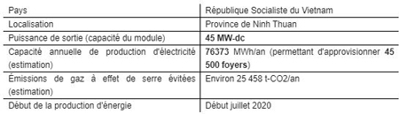 Cette nouvelle centrale solaire possède une puissance d’environ 45 MW-c.c., avec une capacitée de production annuelle d’électricité estimée à 76 373 MWh. L’équivalent de la quantité d’énergie consommée en un an par près de 40 500 foyers vietnamiens.